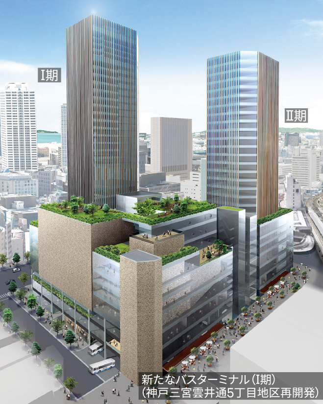 三宮には九州、四国方面等への中長距離バスが1日1,700便ほどあり、乗降場が点在しています。それらを集約する新たなバスターミナルの整備計画があり、完成すれば西日本最大級のバスターミナルとなります。2020年4月に国の直轄道路事業として事業化され、バスターミナルに加え、図書館、ホール、オフィス、ホテルなどの複合用途の開発が進んでいます。