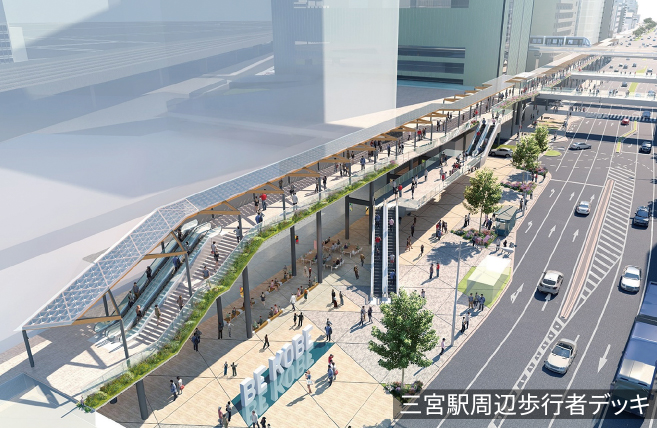 さらに神戸市はバスターミナルとJR三ノ宮新駅ビルをつなぐ歩行者デッキも並行して整備を進めています。2027年度以降、これが順次完成すればバリアフリーで東西移動ができるようになり、乗り換えの利便性が格段に高まります。