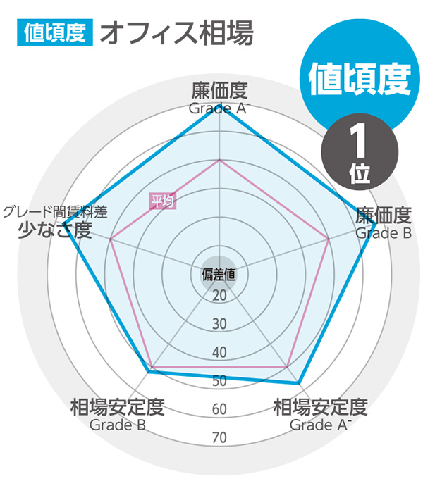 下記1~5のオフィス相場の割安感・リーズナブルさを指し示す項目における、各エリアの偏差値の合計による順位。