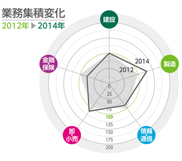 平成26年経済センサス基礎調査(総務省)による2014年の業務集積傾向。対象エリア内全従業者数に対する、建設業、製造業、情報・通信業、卸・小売業、金融・保険業の各従業者数の割合を示した。