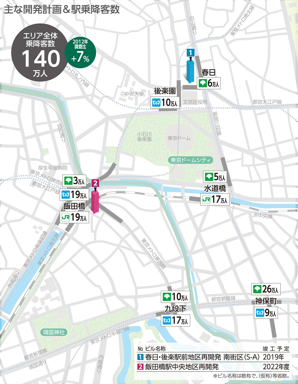 各社発表の最新調査によるエリア内各駅の1日当たりの平均乗降客数〈概ね2015年データ〉。JR駅は乗車人員の倍数。増減割合は2012年調査比〈概ね2010年データ〉。