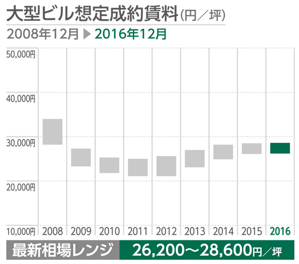 CBREが選定する規模及び設備で対象エリアを代表すると考えられる複数のオフィスビル(Gradeは問わず選定)の坪当たり想定成約賃料(共益費を含む、フリーレント等のインセンティブは考慮しない)をもとに作成。2008年12月期から最新2016年12月期のレンジ推移。なお、同数値は不動産市場における賃料水準に関する意見であり、成約賃料等を保証するものではない。