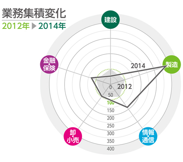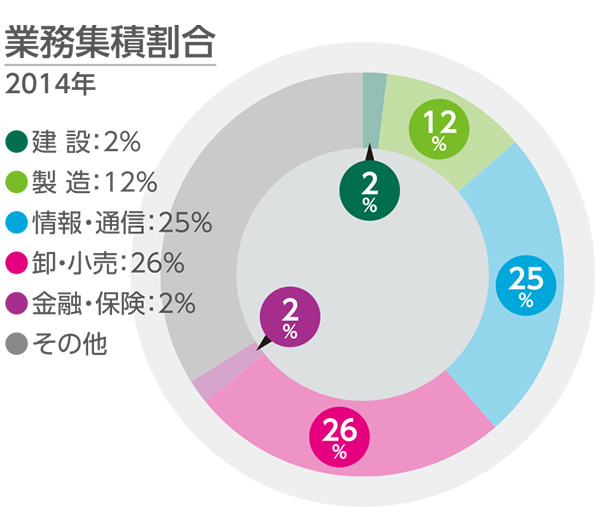 平成26年経済センサス基礎調査(総務省)による2014年の業務集積傾向。対象エリア内全従業者数に対する、建設業、製造業、情報・通信業、卸・小売業、金融・保険業の各従業者数の割合を示した。