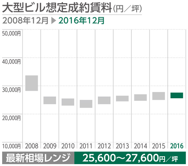 CBREが選定する規模及び設備で対象エリアを代表すると考えられる複数のオフィスビル(Gradeは問わず選定)の坪当たり想定成約賃料(共益費を含む、フリーレント等のインセンティブは考慮しない)をもとに作成。2008年12月期から最新2016年12月期のレンジ推移。なお、同数値は不動産市場における賃料水準に関する意見であり、成約賃料等を保証するものではない。