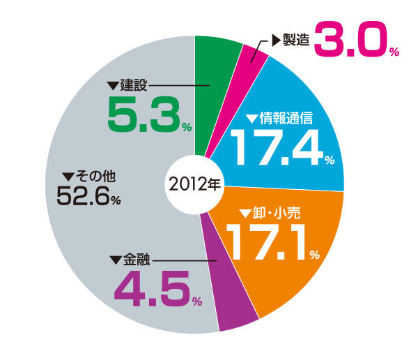 当該ビジネスエリアにおける2012年の業務集積傾向。「平成24年経済センサス活動調査(総務省)」より、エリア内全従業者数に対して、建設業、製造業、情報通信業、卸・小売業、金融業の各従業者数の割合を示した。