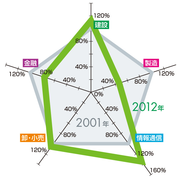 当該ビジネスエリアにおける、2001年から2012年の業務集積傾向の変化。建設業、製造業、情報通信業、卸・小売業、金融業の5業種において、2001年の各従業員を100としたときの2012年の割合を算出し、五角形のレーダーチャートで示した。 ※誌面の関係上、「品川」エリアのみ基準となる2001年の正五角形を縮小して示した。また、「品川」と「大崎」は、五角形の配置が他エリアと異なっている。