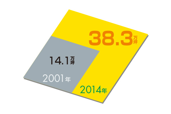 2001年と2014年における賃貸オフィスビルの貸床ストックの変化。数値はCBREが設定した当該ビジネスエリア内にある原則として延床面積1,000坪以上、かつ新耐震基準に準拠した賃貸オフィスビルを対象としている。