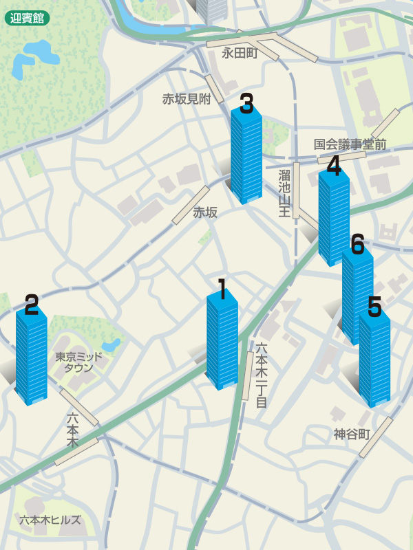 繁華街のイメージが強い赤坂だが、複数の地下鉄路線が利用でき山手線のちょうど中心という立地特性から、幅広い業種業態の需要を集めている。特にIT、放送、広告、アパレルの集積が目立つが、一方で霞ヶ関の官公庁にも近く、通信、法律事務所といった業種にも人気が高い。また大使館や高級ホテルが多く、外資系企業が多い点も特徴の一つである。六本木は、六本木ヒルズ竣工以降、外資系企業、IT企業、コンサルティング業などの企業集積が見られ、特に外資系金融においては、丸の内・大手町と競合する主要エリアとなっている。ここ数年も大規模開発が相次ぎ、ビジネス街としての存在感を高める一方で、大規模開発と従来からの中小ビル間に大きな格差と、業種的にやや偏った集積が見られる面もある。さらにエリアの成熟度を増すためにも、幅広い企業誘致に期待がかかる。