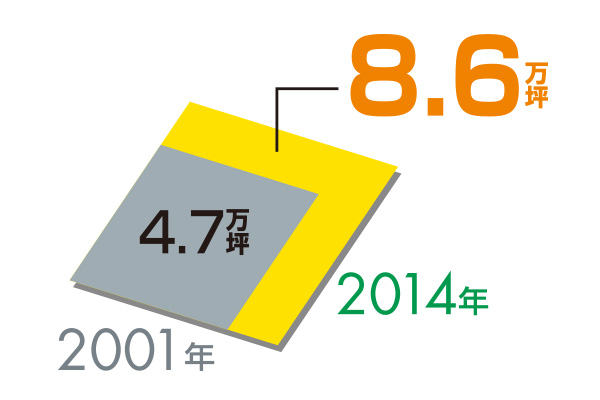 2001年と2014年における賃貸オフィスビルの貸床ストックの変化。数値はCBREが設定した当該ビジネスエリア内にある原則として延床面積1,000坪以上、かつ新耐震基準に準拠した賃貸オフィスビルを対象としている。