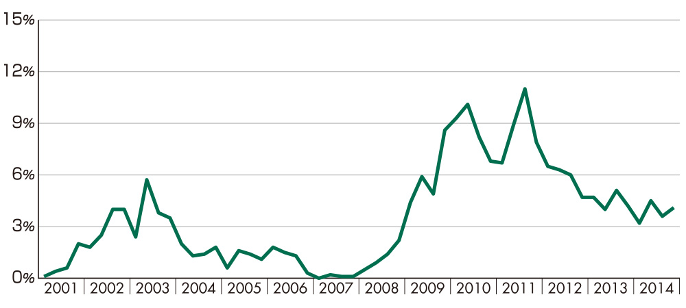 2001年3月期から2014年12月期までの空室率推移。原則として延床面積1,000坪以上、かつ新耐震基準に準拠した賃貸オフィスビルで、空室は集計時点で入居可能なものを対象としている。