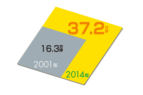 2001年と2014年における賃貸オフィスビルの貸床ストックの変化。数値はCBREが設定した当該ビジネスエリア内にある原則として延床面積1,000坪以上、かつ新耐震基準に準拠した賃貸オフィスビルを対象としている。