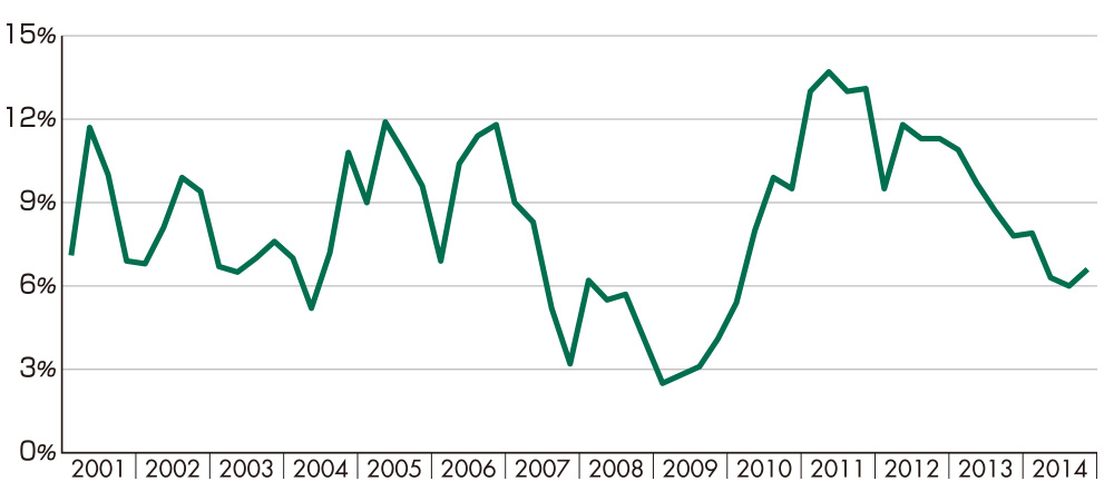 2001年3月期から2014年12月期までの空室率推移。原則として延床面積1,000坪以上、かつ新耐震基準に準拠した賃貸オフィスビルで、空室は集計時点で入居可能なものを対象としている。