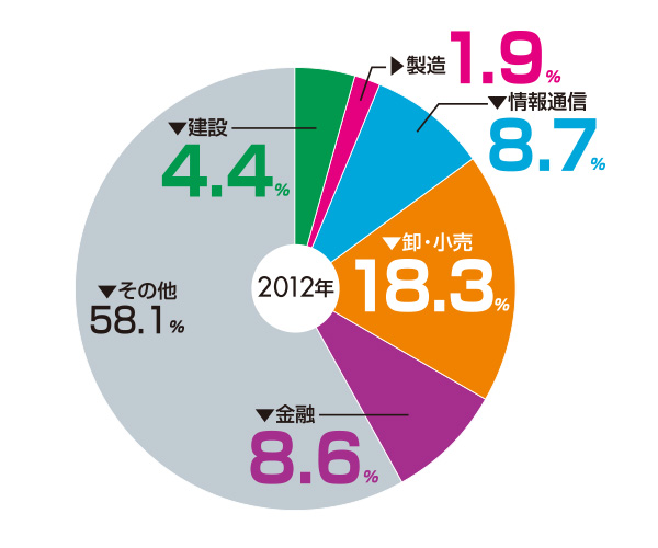 当該ビジネスエリアにおける2012年の業務集積傾向。「平成24年経済センサス活動調査(総務省)」より、エリア内全従業者数に対して、建設業、製造業、情報通信業、卸・小売業、金融業の各従業者数の割合を示した。