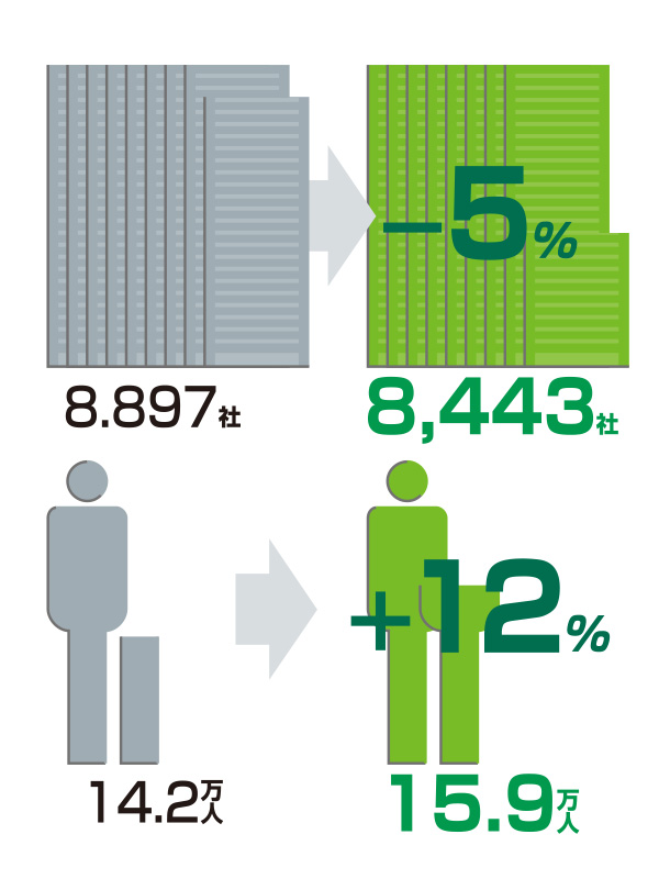 2001年と2012年における当該ビジネスエリアに所在する事業所数と、そこで働く従業員数の変動。2001年は「平成13年事業所企業統計調査(総務省)」の総事業所数・総従業者数からそれぞれ産業分類の「公務」を除いた数値。2012年は「平成24年経済センサス活動調査(総務省)」の総事業所数・総従業者数を用いた。 ※経済センサス活動調査では、当初から「国及び地方公共団体の事務所」は調査対象から除かれている。