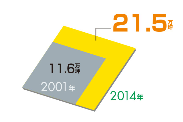 2001年と2014年における賃貸オフィスビルの貸床ストックの変化。数値はCBREが設定した当該ビジネスエリア内にある原則として延床面積1,000坪以上、かつ新耐震基準に準拠した賃貸オフィスビルを対象としている。