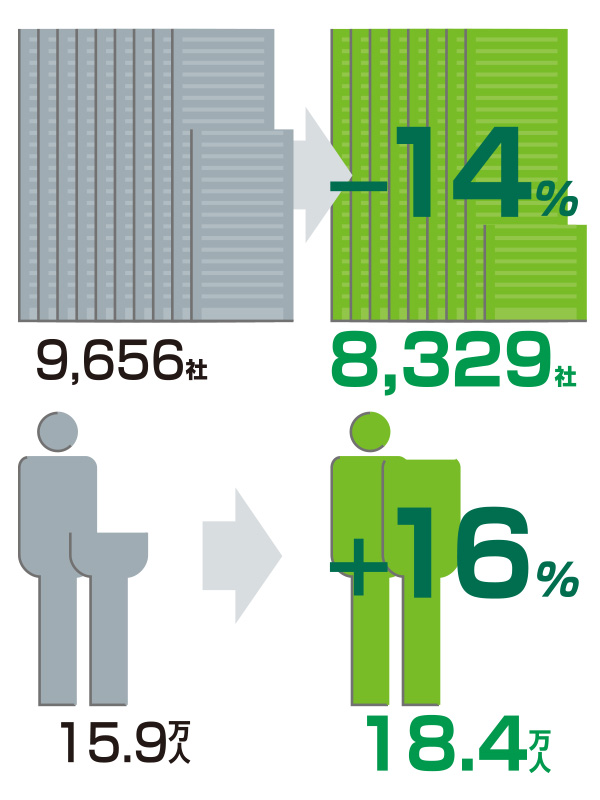 2001年と2012年における当該ビジネスエリアに所在する事業所数と、そこで働く従業員数の変動。2001年は「平成13年事業所企業統計調査(総務省)」の総事業所数・総従業者数からそれぞれ産業分類の「公務」を除いた数値。2012年は「平成24年経済センサス活動調査(総務省)」の総事業所数・総従業者数を用いた。 ※経済センサス活動調査では、当初から「国及び地方公共団体の事務所」は調査対象から除かれている。