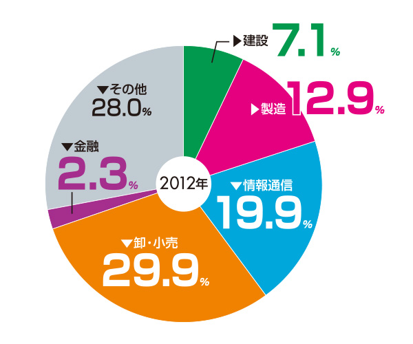 当該ビジネスエリアにおける2012年の業務集積傾向。「平成24年経済センサス活動調査(総務省)」より、エリア内全従業者数に対して、建設業、製造業、情報通信業、卸・小売業、金融業の各従業者数の割合を示した。