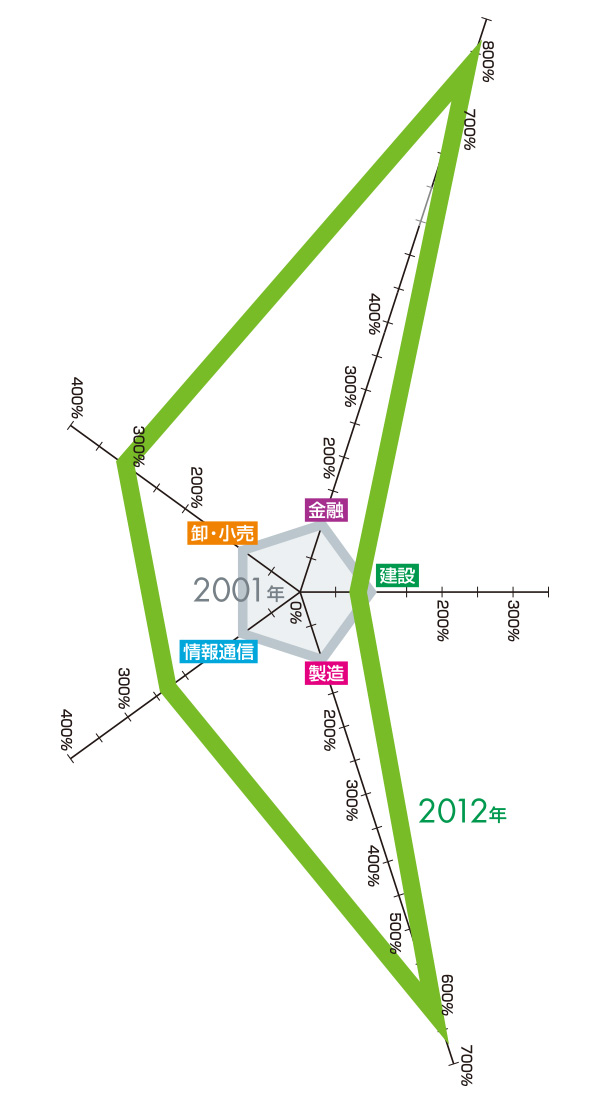 当該ビジネスエリアにおける、2001年から2012年の業務集積傾向の変化。建設業、製造業、情報通信業、卸・小売業、金融業の5業種において、2001年の各従業員を100としたときの2012年の割合を算出し、五角形のレーダーチャートで示した。 ※誌面の関係上、「品川」エリアのみ基準となる2001年の正五角形を縮小して示した。また、「品川」と「大崎」は、五角形の配置が他エリアと異なっている。