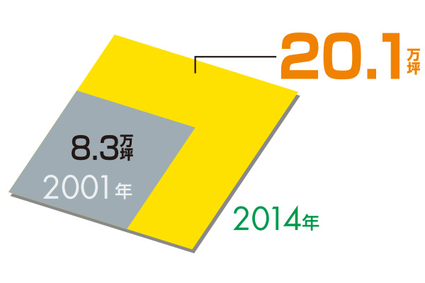 2001年と2014年における賃貸オフィスビルの貸床ストックの変化。数値はCBREが設定した当該ビジネスエリア内にある原則として延床面積1,000坪以上、かつ新耐震基準に準拠した賃貸オフィスビルを対象としている。