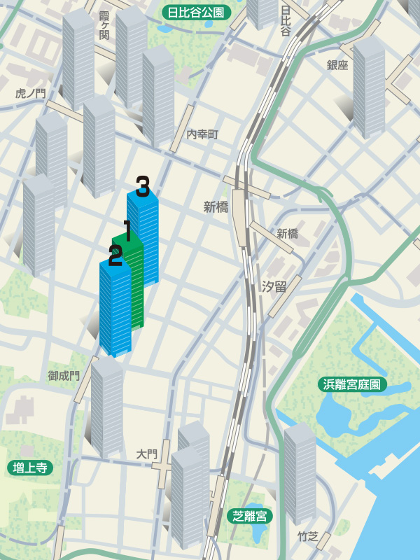 JR新橋駅の西側は、昔からビジネス街として発展し、中小規模のビルが多数集積している。老朽化が著しいビルも多く、これらは企業誘致に苦戦し賃料水準も低い状態である。駅前SL広場一帯の再開発が計画されており、今後、汐留から虎ノ門まで一体となった活性化が期待される。新橋駅東側の汐留は、再開発で2004年に主要なビルがオープンした新興のビジネス街である。主要テナントは日本テレビや電通等のメディア系、富士通やソフトバンク等のIT系及びメーカー本社も多数所在している。とりわけ汐留シオサイトの高層ビル群はフロアプレートの大きいグレードA物件となり、新橋駅周辺の中でも需要が高い。大型新規供給はしばらくないが、隣接する虎ノ門や浜松町では大規模再開発が予定されているため、エリア間競争が激しくなることが予想される。
