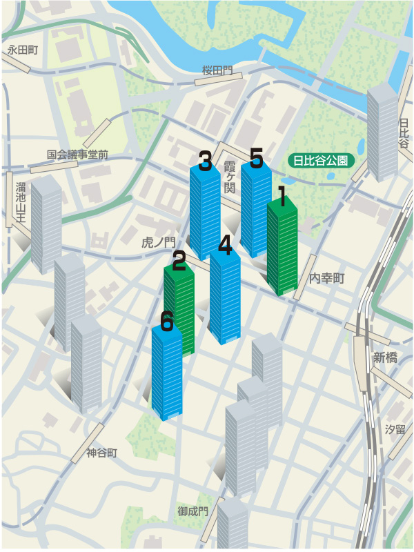 虎ノ門では、近年大規模ビルが高い稼働率で数棟竣工し、さらに環状二号線開通もあり街全体が活気づいている。霞ヶ関に隣接し、官公庁関連や海運業界、その他外資系企業からも根強い需要があり空室は減少、賃料は上昇傾向にある。ただし、オフィス街として成熟しているため、築年数を経たビルや駅から遠い小規模ビルも多く、築年数の浅い大型ビルとの二極化が進行している。霞ヶ関は我が国の政治の中枢であり、賃貸床のかなりの部分を、庁舎、会館、政府系の施設が占めている。そのような土地柄、以前は永田町寄りには関連する政府系団体等、霞ヶ関寄りには公益法人、独立行政法人等が集積していたが、行政改革等による再編縮小、他エリアへの流出と大型ビル再開発に合わせた民間企業の進出も進み、現在はコンサルタント業や監査法人、外資系企業も増えてきている。