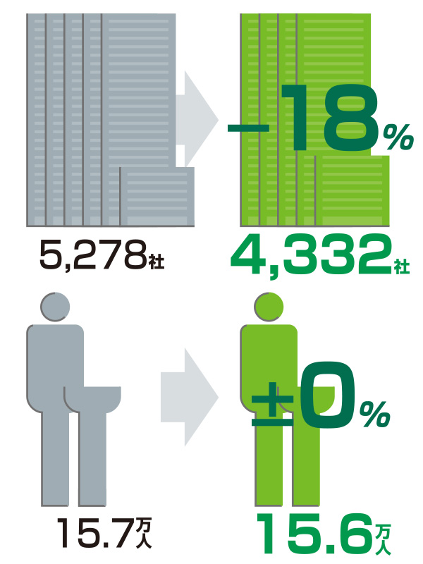 2001年と2012年における当該ビジネスエリアに所在する事業所数と、そこで働く従業員数の変動。2001年は「平成13年事業所企業統計調査(総務省)」の総事業所数・総従業者数からそれぞれ産業分類の「公務」を除いた数値。2012年は「平成24年経済センサス活動調査(総務省)」の総事業所数・総従業者数を用いた。 ※経済センサス活動調査では、当初から「国及び地方公共団体の事務所」は調査対象から除かれている。