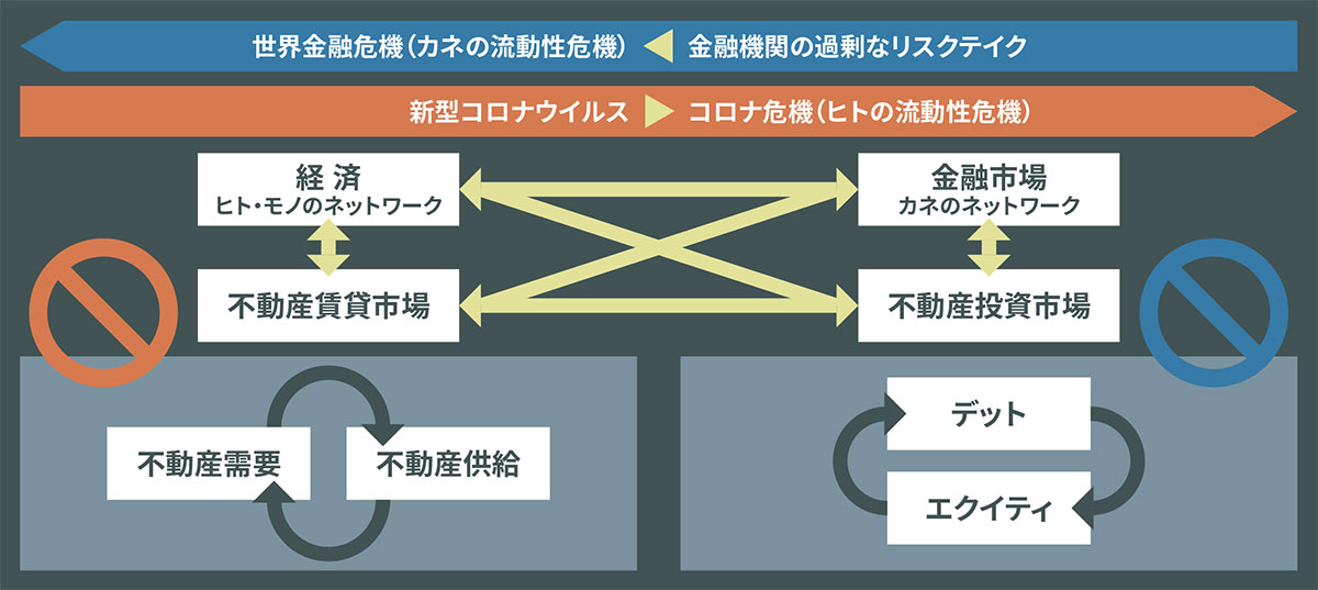 コロナ禍が不動産市場へ与えたインパクトを考える上で、参考にしたのが2007年以降のリーマンショックです。当時の金融危機は米国のサブプライムローン問題を発端とし、金融市場における流動性低下に起因するものでした。このような「カネ」の目詰まりの影響を受ける筆頭が資本集約型の不動産業であり、当時はアセットの種類を問わず、すべての不動産が、深刻な打撃を被ることになりました。