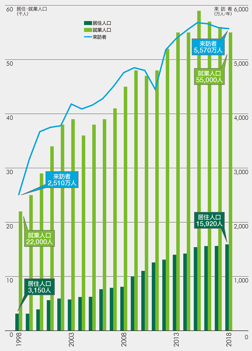 今年、ベイエリアが東京版Society5.0「スマート東京」※の先行実施エリアに指定され、臨海副都心においても、5Gなどの最先端技術を活用したまちづくりが進められると考えられます。臨海副都心の来訪者、居住人口、就業人口とも増加傾向にある中、今後も開発の進展にともなって増加していくと予想されます。