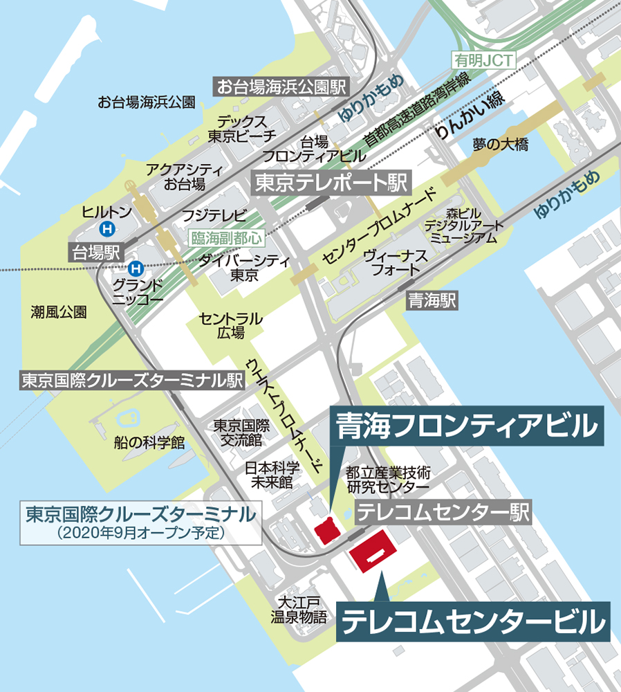 | 交通 | ゆりかもめ「テレコムセンター」駅直結、 りんかい線「東京テレポート」駅より無料循環バス(平日)乗車3分 |