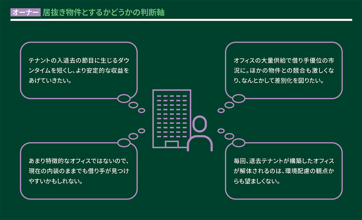 ビルオーナーとしては、要は原状回復して退去してもらった方が得か、居抜きで新規テナントにすぐ入居してもらった方が得かという天秤にかけて判断できることが最大のメリットです。事実、外資系の企業には居抜きオフィスを気にせず選択する文化があるため、そうした企業を多くテナントに持つ大手のビルオーナーは、コロナ前から居抜きを受け入れていました。その方が賃料未収のリスクも、差別化になることも知っているからです。それが、最初にお伝えした通り、コロナ以降は意識も変わり、様々なビルオーナー側から居抜きを打診されることも増えてきました。