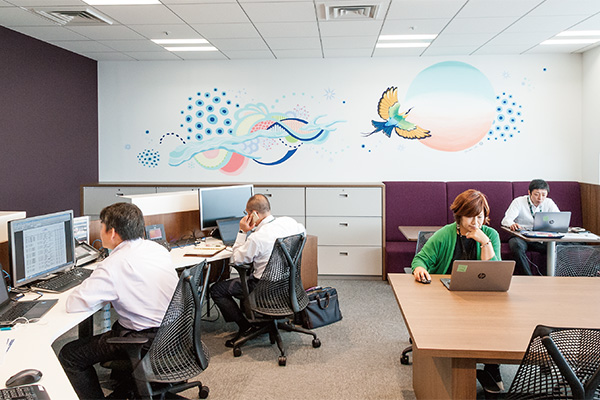 2014年4月、CBRE東京本社が浜松町から丸の内へ移転した際、新オフィスではABWを導入しました。それまで固定席で働いていた約550名の社員(移転当時)が、1,145坪のオフィスに設置された15種類の多様なスペースを、その日の仕事の状況に応じて選択できる執務環境となりました。移転後の調査で、新オフィスで生産性が高まったと社員は評価しています。