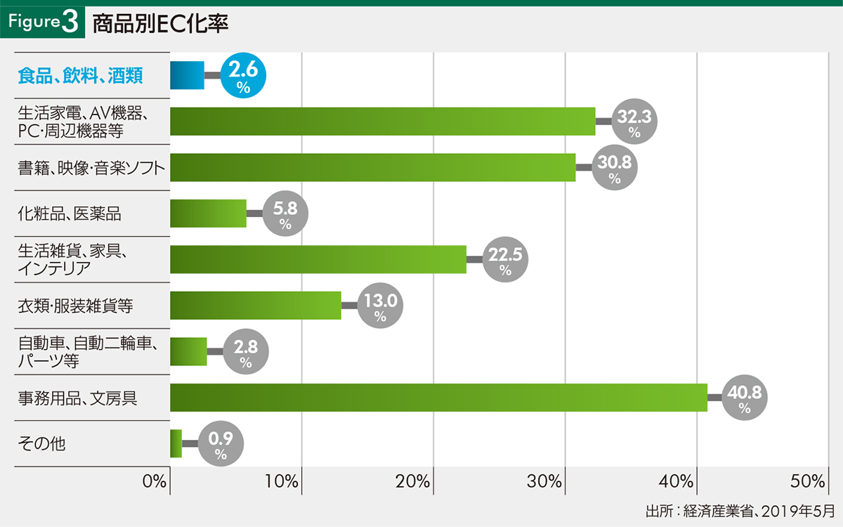 食品類(食品、飲料、酒類)は百貨店・スーパーマーケット・コンビニエンスストア販売額の63%を占め、日々の買い物の多くを占めるマーケットである。にもかかわらず、食品類のEC化率は2018年で2.6%〔Figure3〕。他の品目のEC化率は、事務用品が40.8%、衣類でも13.0%という数字がある中で、食品類の化率は最低水準。この食品類の宅配に成長余地は大きいとみて、ネットスーパーが2014年ごろから始まり、2017年にアマゾンフレッシュが生鮮品宅配を始めた。楽天は西友と提携し本格的なネットスーパーに参入したほか、サブスクリプションモデルの生鮮食品宅配オイシックス・ラ・大地も買収により業容を拡大した。これらの宅配には、生鮮品のカテゴリーだけでなく、時短ニーズに対応した半調理食品、ミールキットなどの調理簡便商品なども含まれる。