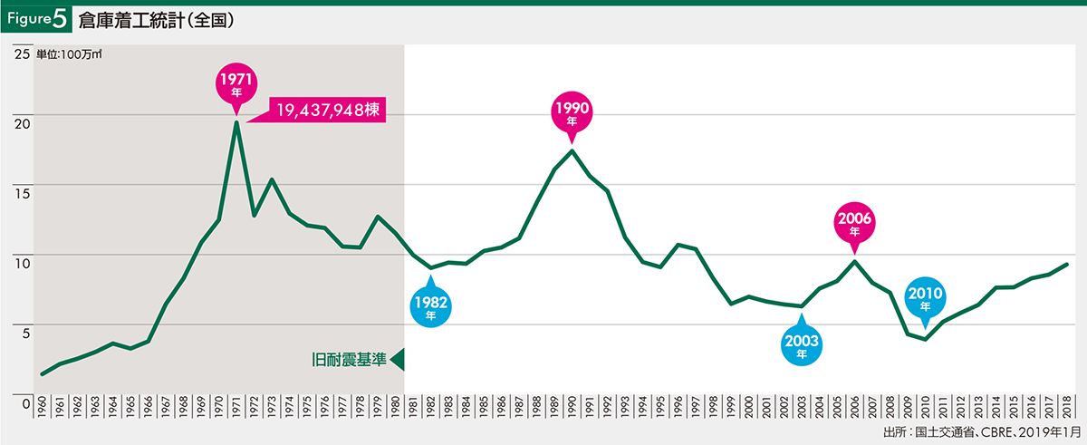 倉庫が最も多く着工されたのは高度成長期の1971年。その前後の年を含む時期に全国で多くの倉庫が建てられたが、それらは2030年には築60年に迫る〔Figure5〕。固定資産の概要調書と建築着工統計から推計すると、旧耐震基準の倉庫は全国の倉庫のおよそ33%に上る(2018年時点)。