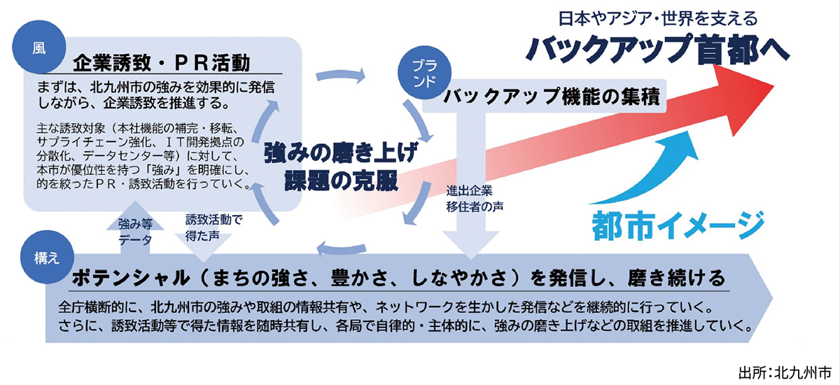 まずは、北九州市の持つ「強み」を知ってもらう取組から推進し、北九州市に企業の経済活動継続に不可欠な機能を集積させ「稼げるまち」を実現しながら、首都圏直下型地震や南海トラフ巨大地震、更にその同時被災などの危機に対峙する日本や、アジア・世界を支える「バックアップ首都」を目指す。