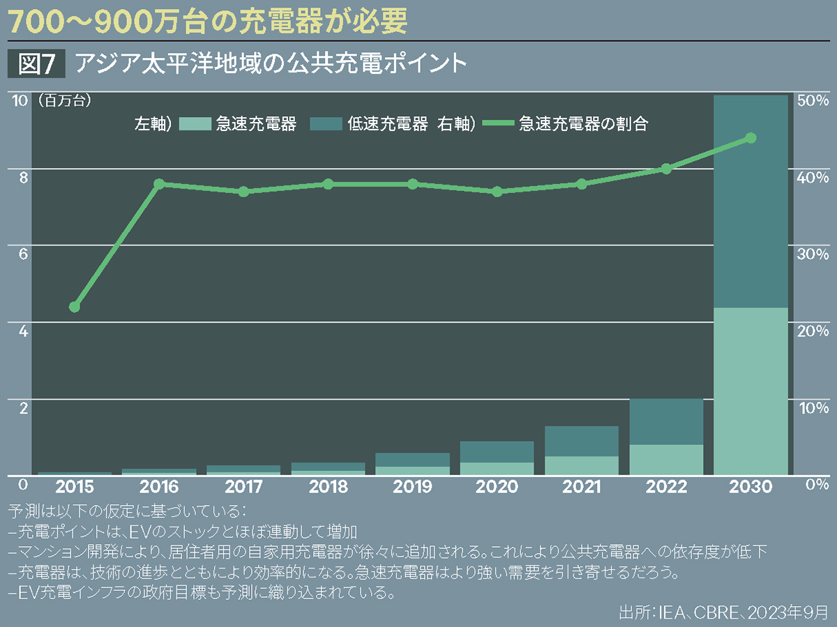 アジア太平洋地域では、EVの増加に伴い、充電ポイントの大幅な増加が必要となる。CBREは、アジア太平洋地域全体の公共充電ポイントの数は、2022年の約200万ヶ所から2030年には約1,000万ヶ所に増加すると予測している。〔図7〕