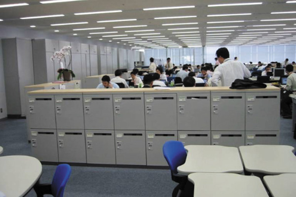 机や椅子は、ユニバーサルデザインで統一した。個人の収納スペースは、営業メンバーは一般的な3段型ローキャビネットを4分割したサイズの“フ リーアドレスボックス”のみ。内勤者は、机の下に入る可動式ワゴンを与えられているが、個人ではなく共有スペースとして利用するよう指導している。原則と して、就業後は書類をすべてここに収納し、入りきらない書類等は保有できない。これは、移転後に紙ベース文書が再び増殖するのを防止するのはもちろん、組 織替えに伴うレイアウト変更にも柔軟に対応できるというメリットがある。