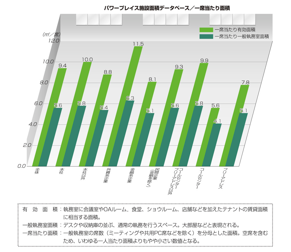 一般に、小規模なオフィスほど一席当たり面積は広くなるためである。 - データ収集者を限定
