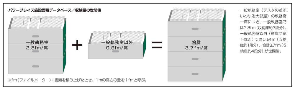 オフィスを計画する際に最もよく出てくるワーカーの不満として、次の3つが挙げられる。すなわち、「オフィスが狭い(もしくは、何かしたいが面積が足りない)」、「書類の収納スペースが少ない」、「会議室が足りない」といったことである。無論、充分に広いオフィスへ移転すればそれですべて解決するのだろうが、施設管理者としては、そのような安易な結論を導くことはないだろう。ならば、何らかの方法でワーカーと経営者を説得しなくてはならない。そこで引き合いに出されるものの1つが、前述の「世間値」である。「パワープレイス施設面積データベース」には、当然この3つの課題に応える数値も含まれている。当社ホームページを通して配布しているので、是非活用していただきたい。