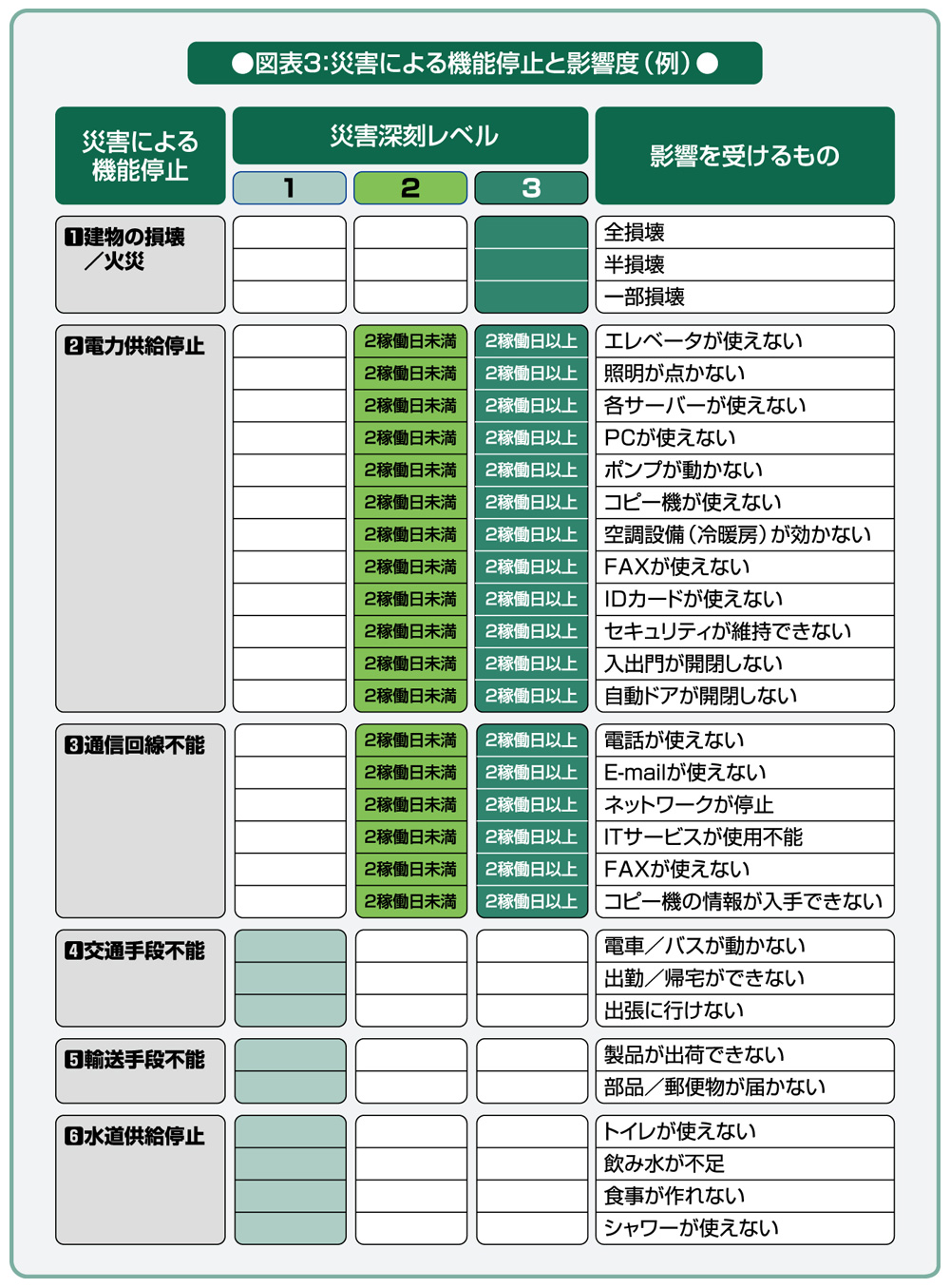 新潟県中越地震や阪神淡路大震災は、まさにCATASTROPHIC(大惨事)レベルであり、レベル3の対応が必要となる。災害による事業所機能停止、深刻レベルとその影響は、下記(図表3)のように、一覧表にしておくことが望ましい。