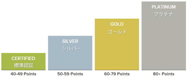 LEED認証には4つのレベルがあり、プロジェクトが獲得するポイント数で、どのレベルになるかが決まります(4つのLEED認証レベルとそれぞれに必要なポイント数は以下の通り)。