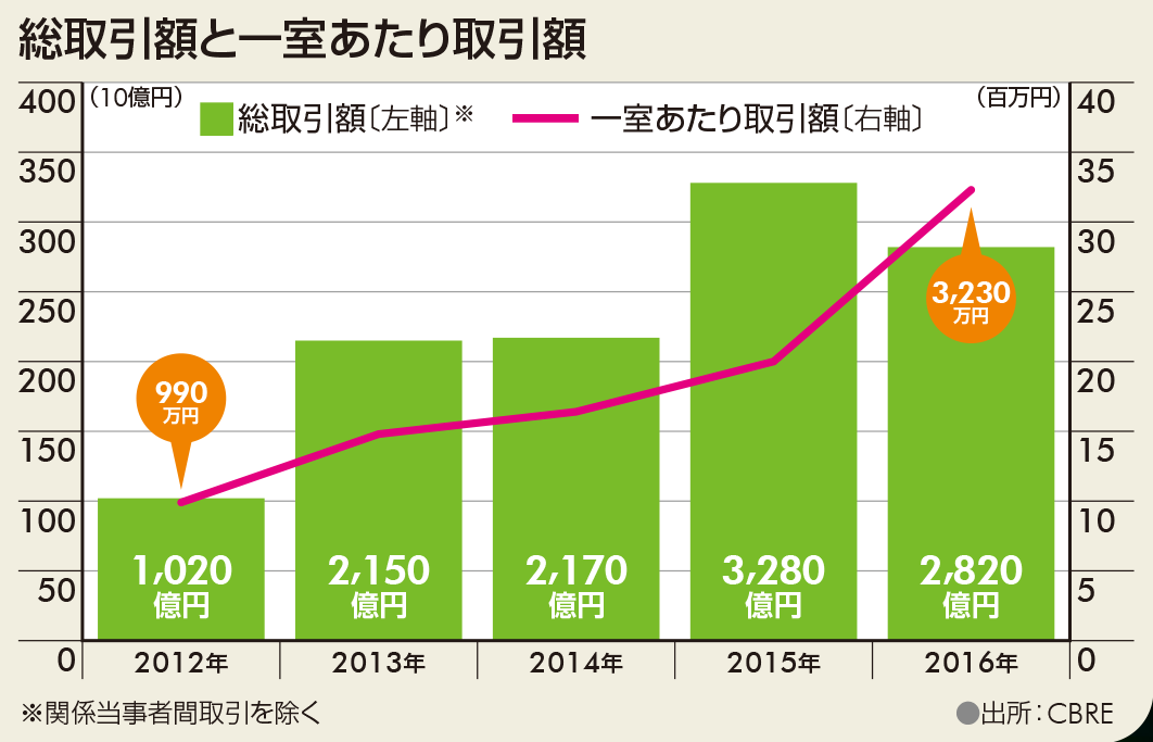 これに伴い、ホテルマーケットの規模も急拡大しており、投資用不動産としては特殊なアセットであったホテルへ、国内外の投資家の関心が集まっています。2016年の取引総額はやや減少したものの、ホテル投資家の間で1つの指標とされている1室当たりの取引額は、2012年比で3倍強となっています。