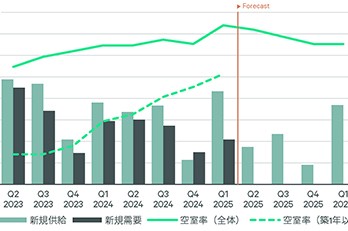 - 今期(Q1)の首都圏大型マルチテナント型物流施設(LMT)の空室率は対前期比1.3ポイント上昇の11.1%。今期の新規供給7棟21.7万坪の稼働率は4割弱にとどまった。一方で、空室が顕在化する前に成約に至るケースも複数あった。実質賃料は、圏央道エリアの下落が影響し対前期比0.2%下落の4,490円/坪となった。