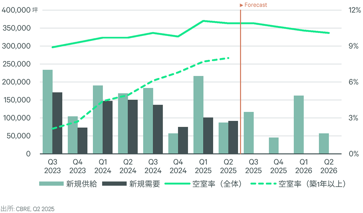 今期(Q2)の首都圏大型マルチテナント型物流施設(LMT)の空室率は10.9%、対前期比0.2ポイントの低下。今期の新規供給4棟8.7万坪のうち、2棟は大きく空室を残して竣工したものの、2棟は満床で竣工し、竣工時稼働率は全体では7割弱となった。既存物件では、 ECを中心にメーカーや卸売業などで新築や築浅物件で大型の成約がみられ、空室消化が進んだが、複数棟で大型テナントの退去により空室が発生した。今期の新規需要は9.1万坪と、過去5年平均12.6万坪を下回る水準にとどまった。