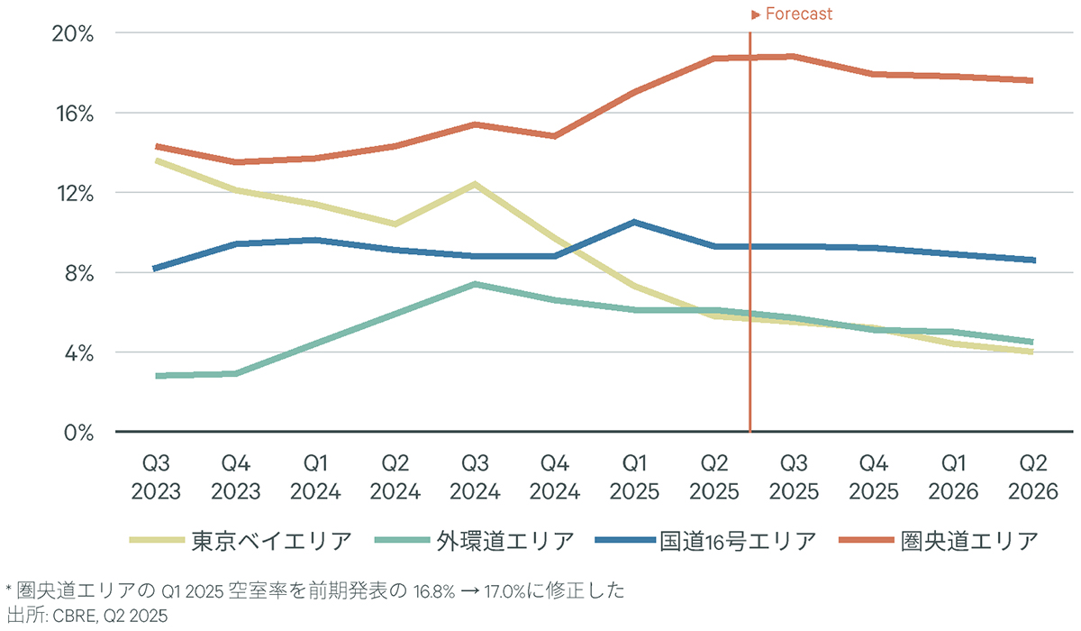 首都圏全体の実質賃料は4,480円/坪、対前期比0.2%の下落。圏央道エリアは2期連続で1%超下落した。一方で、需給バランスが引き締まっている東京ベイエリアを中心に、内側3エリアの賃料は上昇した。