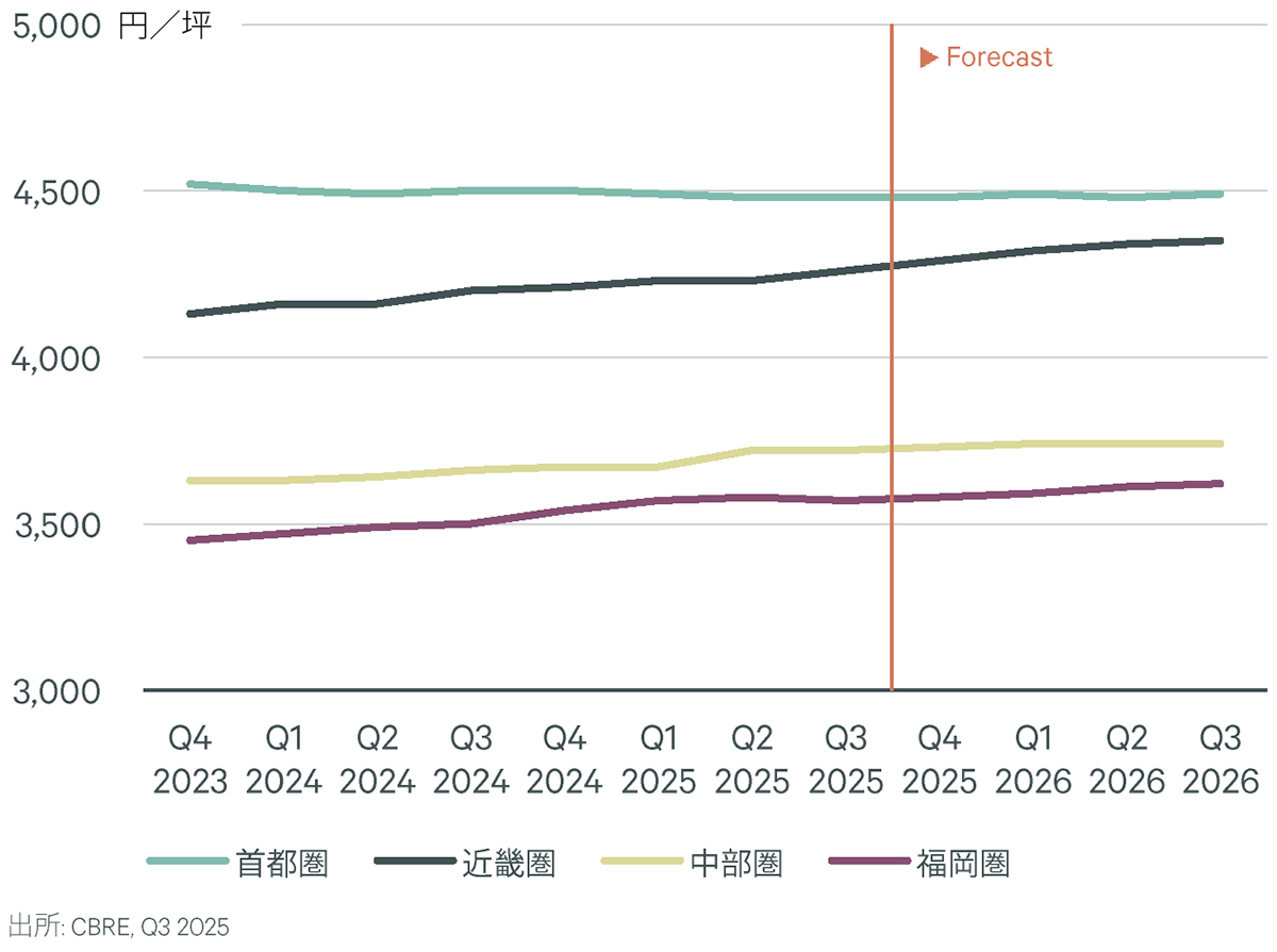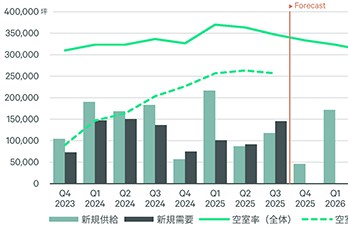 - 近畿圏LMTの空室率は5.0%で、対前期比0.6ポイント低下した。今期の新規供給は3四半期連続の10万坪超えとなる4棟11.3万坪となった。新規需要も12.2万坪で、四半期ベースの過去最大となった。拡張や新規開設に加えて、立地改善や複数拠点の集約を目的とした移転もみられる。実質賃料は4,260円/坪、対前期比0.7%上昇した。新規供給2棟が高稼働で竣工した中心部では賃料が上昇した。