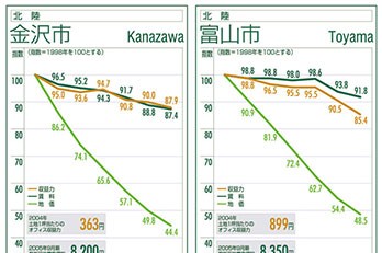 金沢市は賃料と収益力のグラフが上下しながら推移。9~04年の6年間の空室率は7.2ポイントの上昇を見せているものの、貸室面積の増加がほぼ毎年あった...
