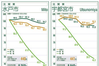 水戸市は、6年間で唯一、00年に賃料が上昇したが、収益力は低下。以降、01年、02年と賃料よりも収益力の低下が大きかったが、03年には空室率が低下...
