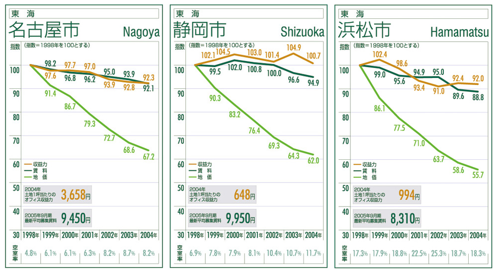 浜松市は、00~02年は賃料水準にさほど変動がなかったものの、空室率が01年に20%台に至り、収益力は低下した。20%台を切った03年は収益力も上昇したが、04年は賃料低下が進み、収益力は0.4ポイント低下。