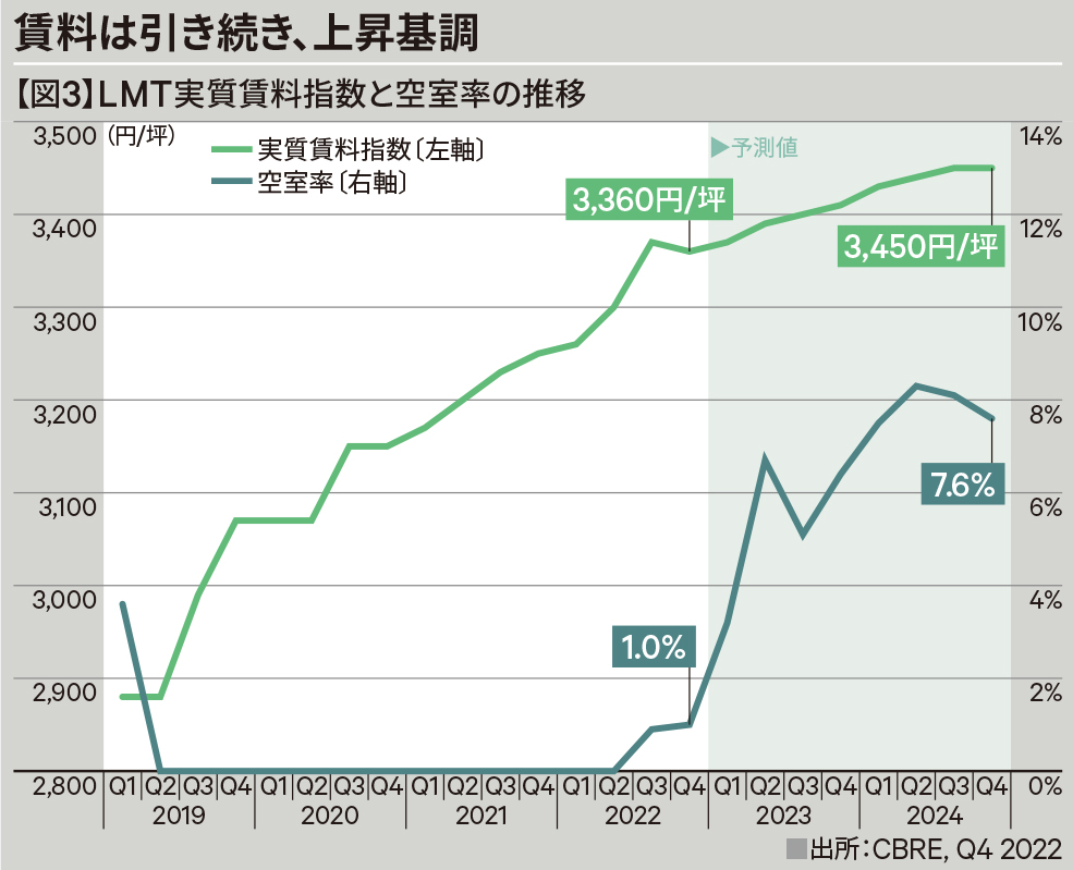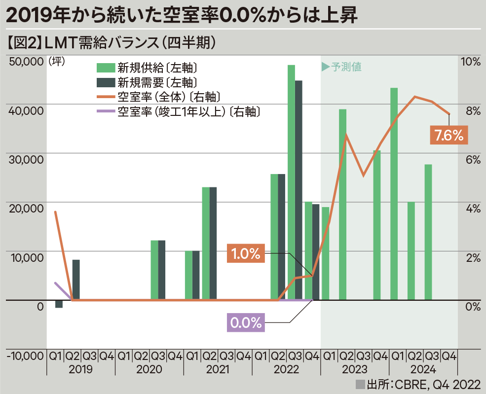 私たちが福岡一帯における大型マルチテナント型物流施設(以下、LMT)の需給バランスを調べたところ、2019年からほぼ0.0%に近いかたちで空室率が推移してきましたが、2022年の第3四半期には新規供給が4.8万坪、新規需要は4.5万坪と、四半期ベースではともに過去最大となり、空室率は0.9%に上昇、第4四半期は1.0%とわずかに上昇するも低い水準を維持することとなりました。【図2】