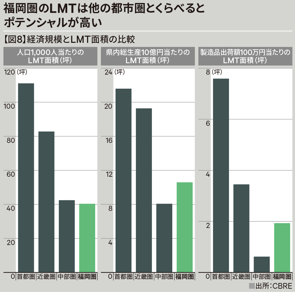 九州全体を見れば、既存の倉庫のうち、約6割を福岡と佐賀の物件が占めています。【図6】でも福岡は、商業中心の街であり、大きな製造工場が少ないのにもかかわらず、製造品出荷額や県内総生産は全国トップ10にランクインし、働き手となる人口も多いエリアです。【図7】eコマースなど、通販型の荷物の取り扱いも増えていますし、このような背景を考えれば、今後もかなりの数の物流施設が福岡周辺に供給されると考えられます。経済規模に対するLMTの面積も、首都圏や近畿圏など、他の都市圏と比較すると、まだまだ伸びしろがあると言える状況です。【図8】